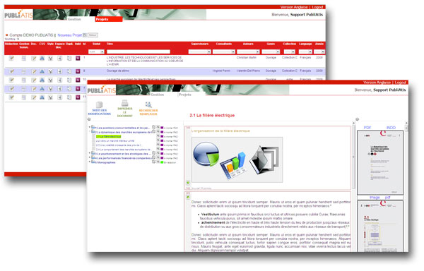 Les contenus sont gérés via un workflow personnalisé permettant de suivre précisément les actions de chacun et gérer le cycle de vie de l’information. PubliAtis Book structure en temps réel les contenus, au format HTLM/ WORD pour les visualisations écrans, PDF et InDesign pour le transfert au pré-presse / à l’imprimeur, et XML pour la diffusion électronique.